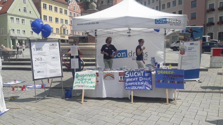 Landsberg, 23.07.2020 – „Drogenabhängige sind Patienten und keine Kriminellen“, heißt es auf einem Schild, das am 21. Juli am Landsberger Hauptplatz die Blicke auf sich zieht. „Drogenkonsumräume retten Menschenleben“, skandiert ein anderes. Es ist der Internationale Gedenktag für verstorbene Drogengebraucher*innen. 1.398 Menschen sind im vergangenen Jahr an den Folgen von Drogenkonsum in Deutschland verstorben, 263 davon in Bayern. Letztere Zahl zeigt einen Anstieg von 28 Menschen im Vergleich zum Vorjahr. Um ihnen zu gedenken und auf durch repressive Drogenpolitik vernachlässigte Möglichkeiten zur Hilfe aufmerksam zu machen, lud die Condrobs Suchthilfe Landsberg zur Kundgebung ein.